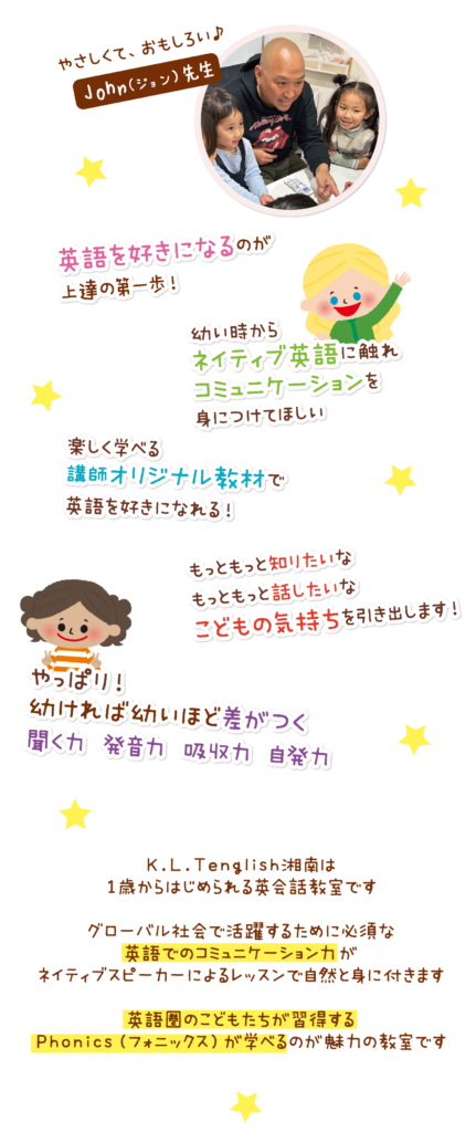 こどもたちが将来必要になる英語を幼い頃からネイティブスピーカー講師と触れ合い、コミュニケーション能力を自然にみにつけられるようになってほしい。幼い時の経験を大切にし、お子様の可能性を広げていきたい。